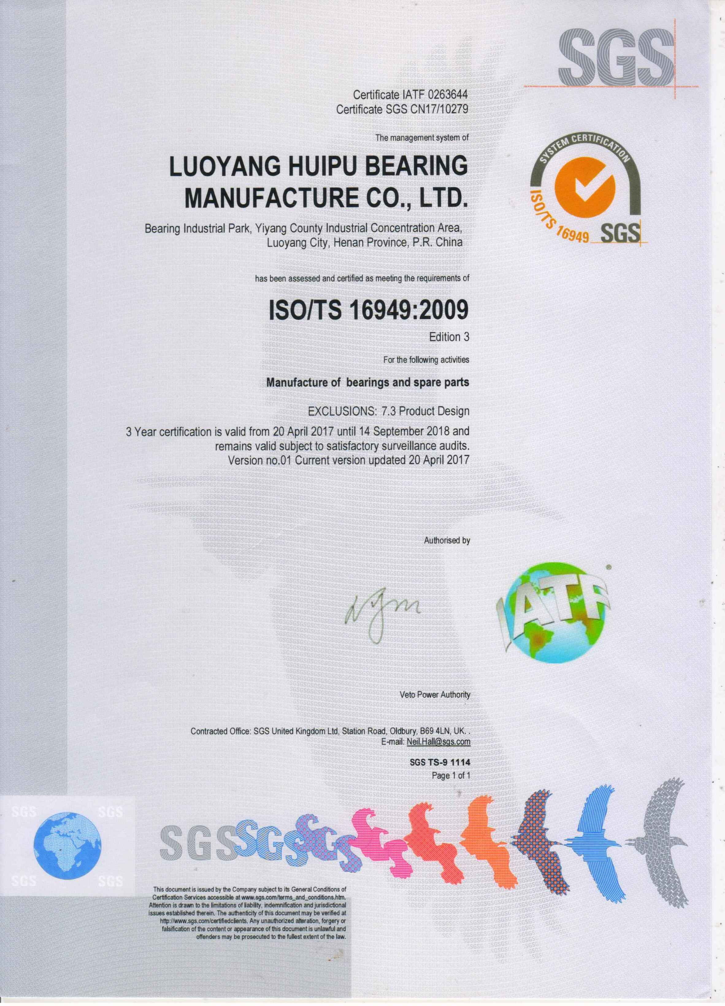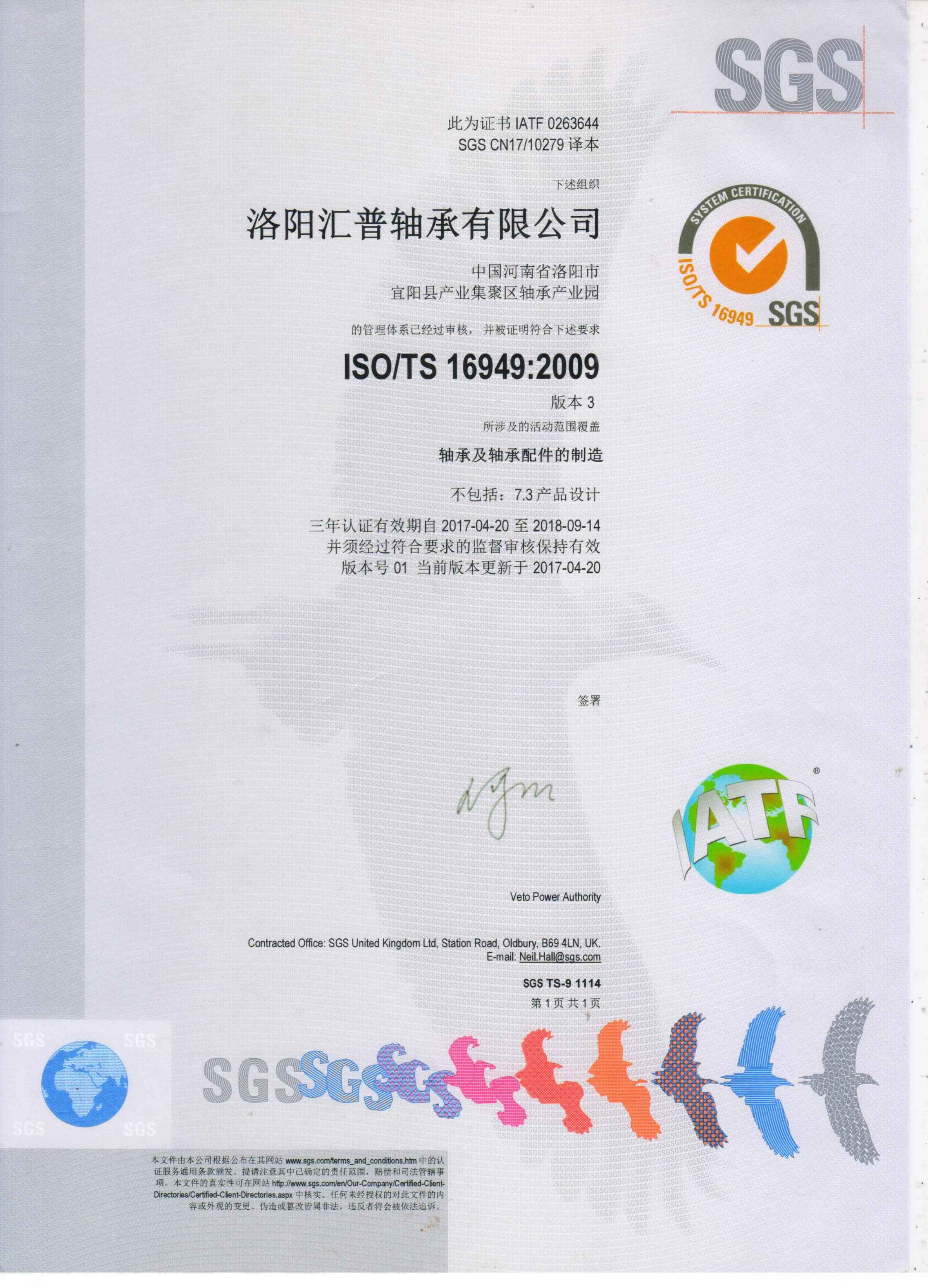 2017年4月匯普軸承順利通過TS16949質量體系認證